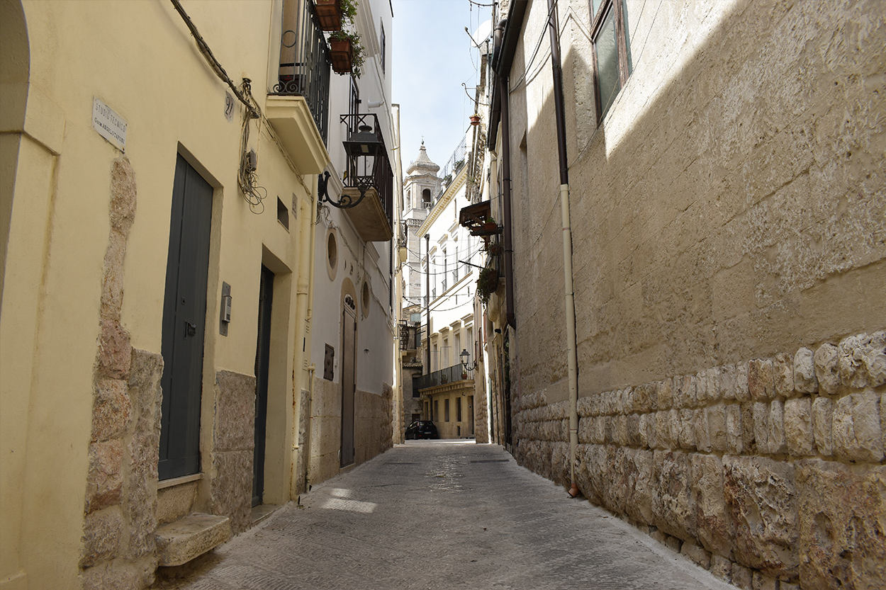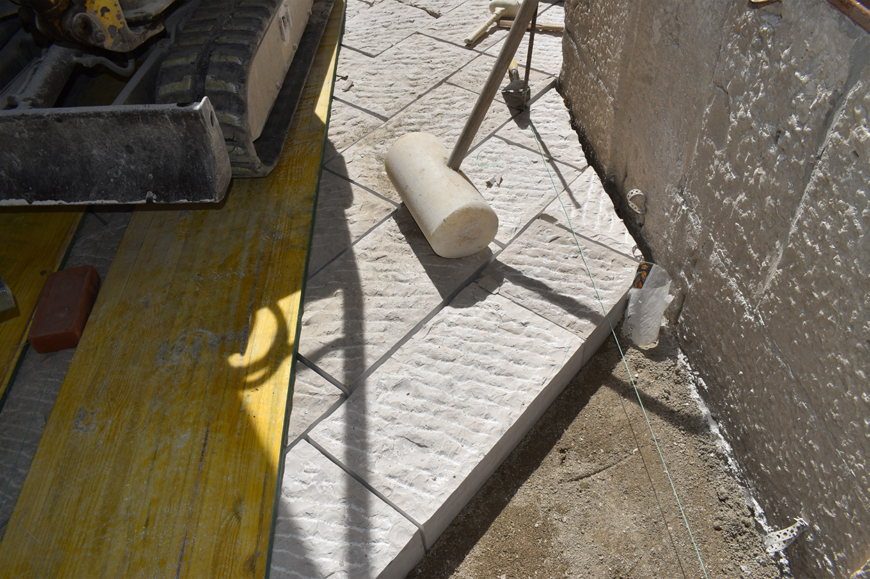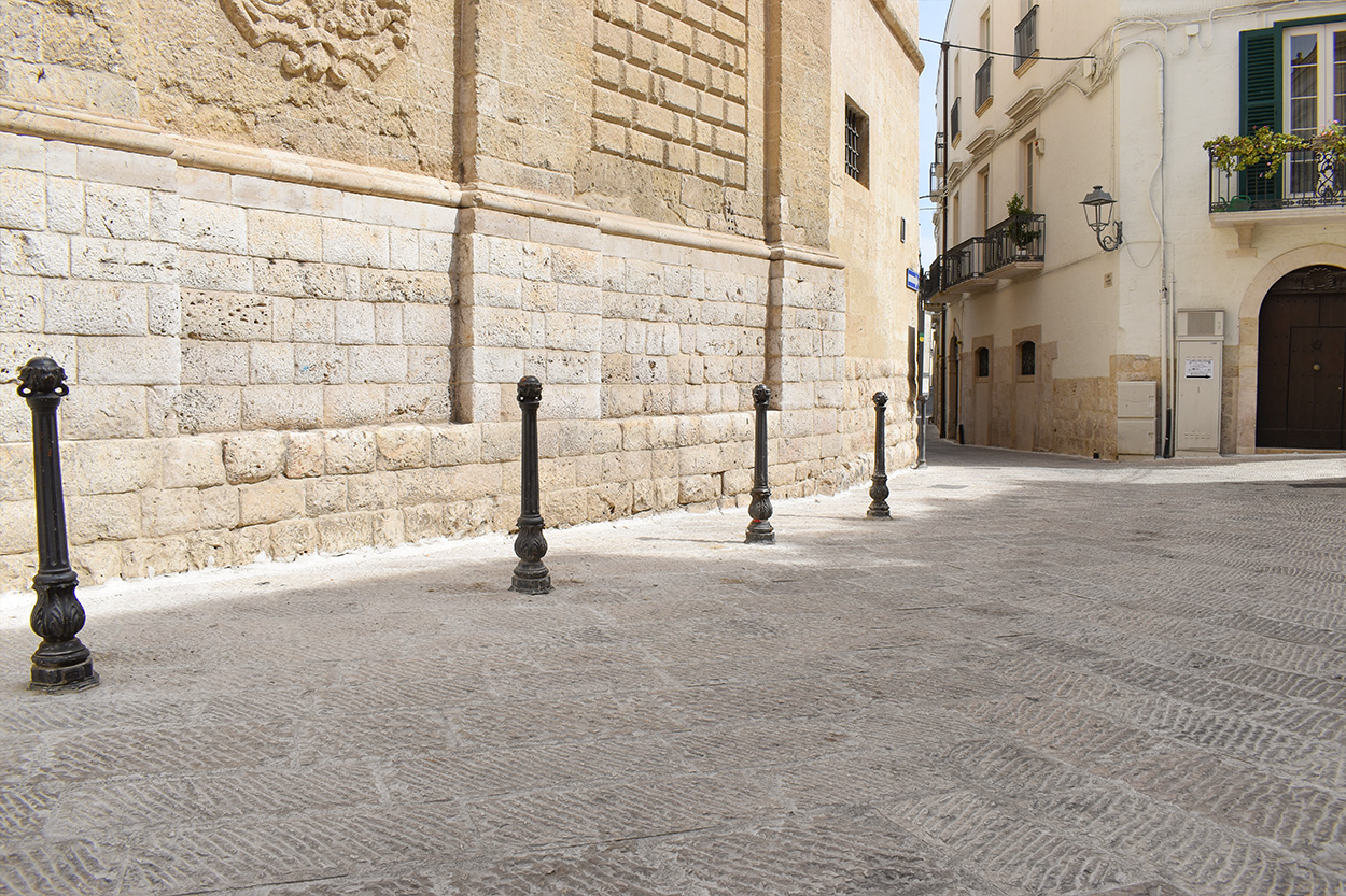È qui che concentriamo il nostro intervento: le basole delle principali vie,di alcuni claustri e piazze della città vecchia sono realizzate in pietra di Apricena con finitura picconata a trapano ad aria che riprende l’estetica delle antiche lavorazioni con martello e scalpello.